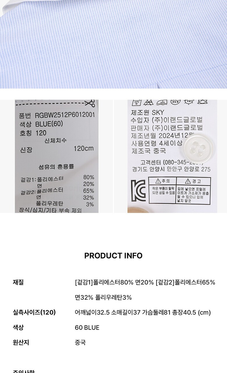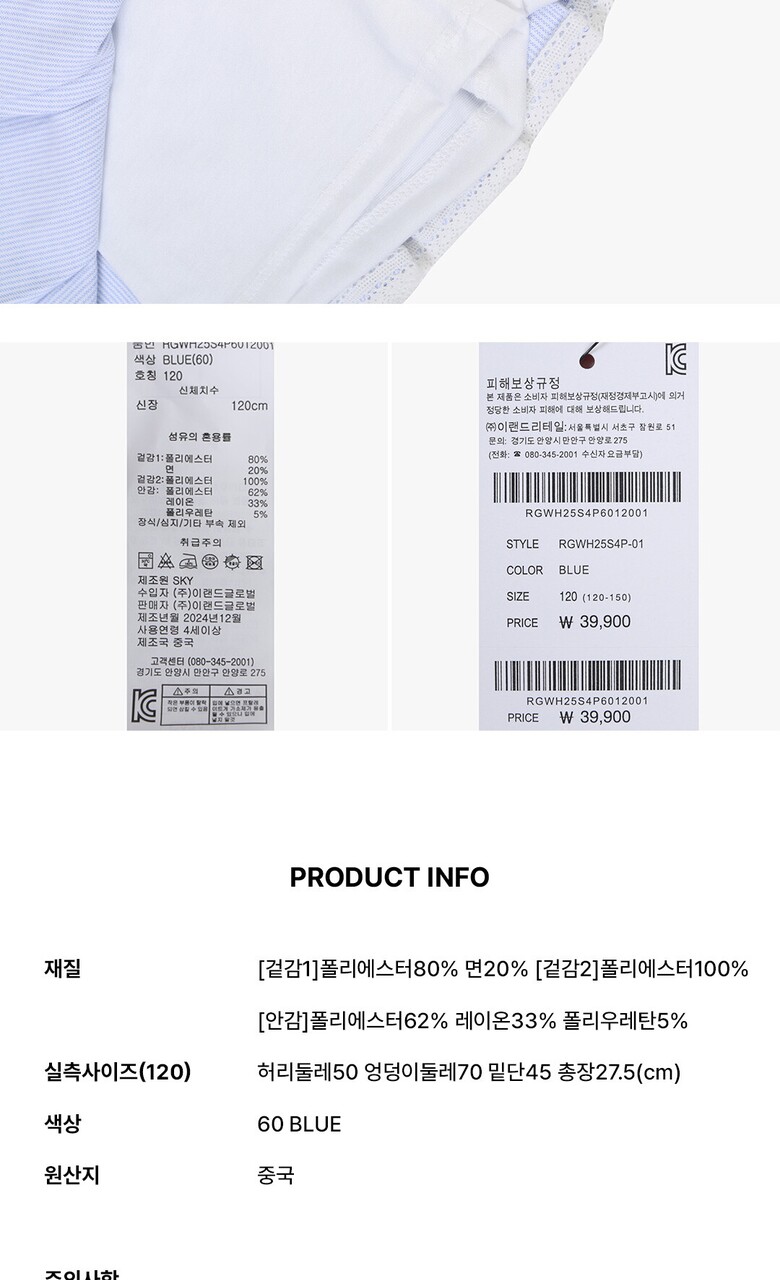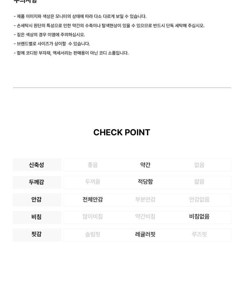 1. 제품 소재 (섬유의 조성 또는 혼용률을 백분율로 표시, 기능성인 경우 성적서 또는 허가서) | 상품상세참조 |