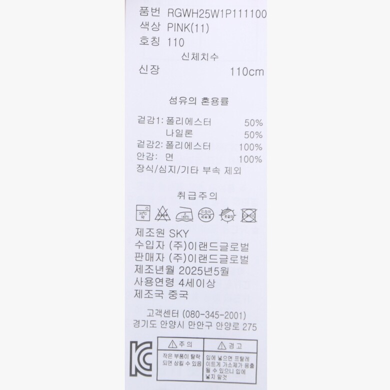 | 1. 제품 소재 (섬유의 조성 또는 혼용률을 백분율로 표시, 기능성인 경우 성적서 또는 허가서) | 상품상세참조 |