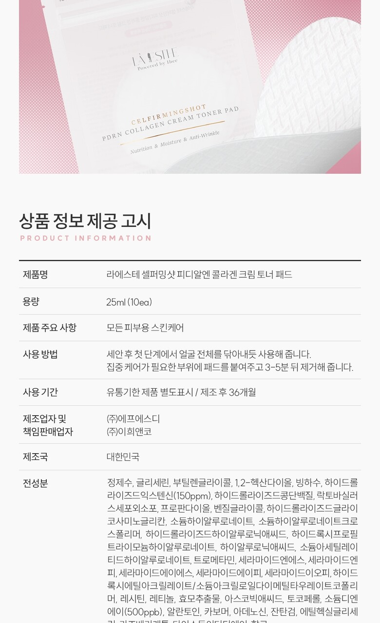 라에스테 셀퍼밍샷 PDRN 콜라겐 크림 토너 패드 25ml(10ea) x 5개