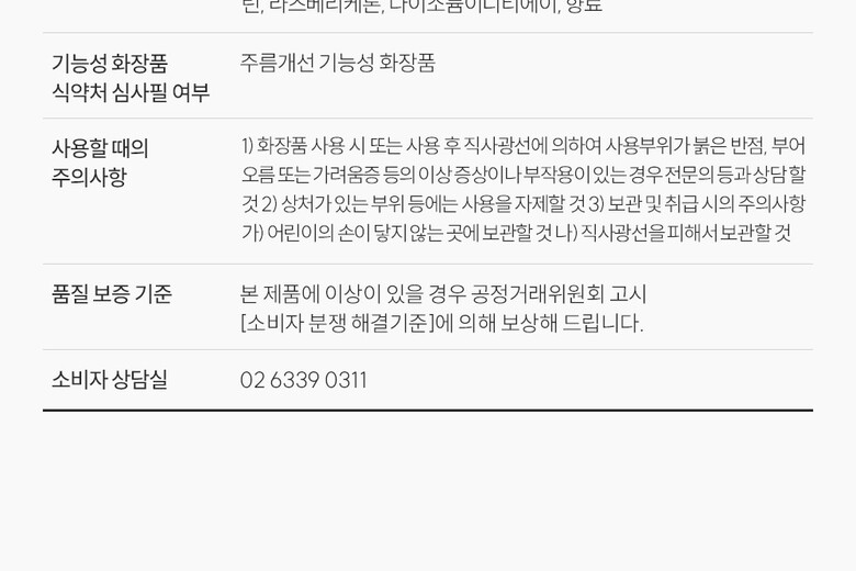 8. 기능성 화장품의 경우 화장품법에 따른 식품의약품안전청 심사 필 유무 | 상세페이지 참조 |