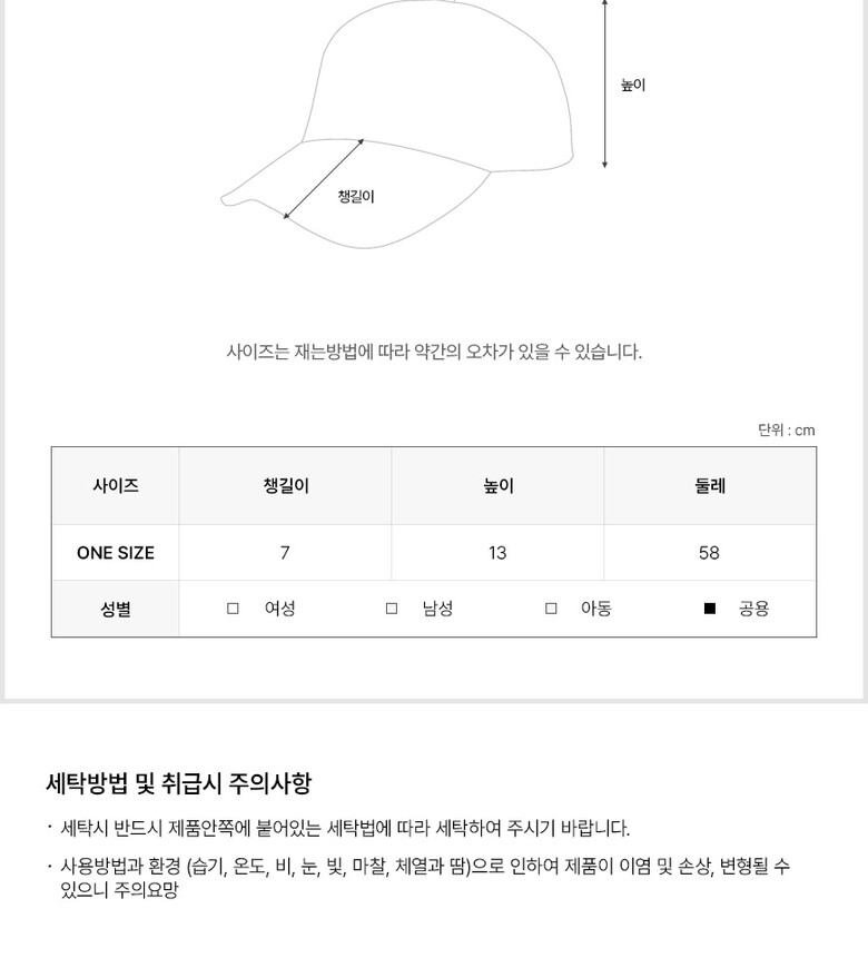 3. 치수 | 챙길이 7cm X 높이 13cm |