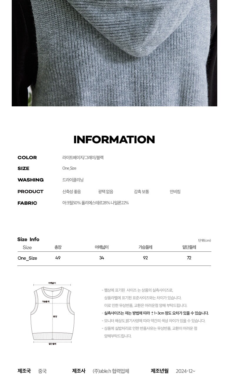 1. 제품 소재 (섬유의 조성 또는 혼용률을 백분율로 표시, 기능성인 경우 성적서 또는 허가서) | 아크릴50% 폴리에스테르28% 나일론22% |