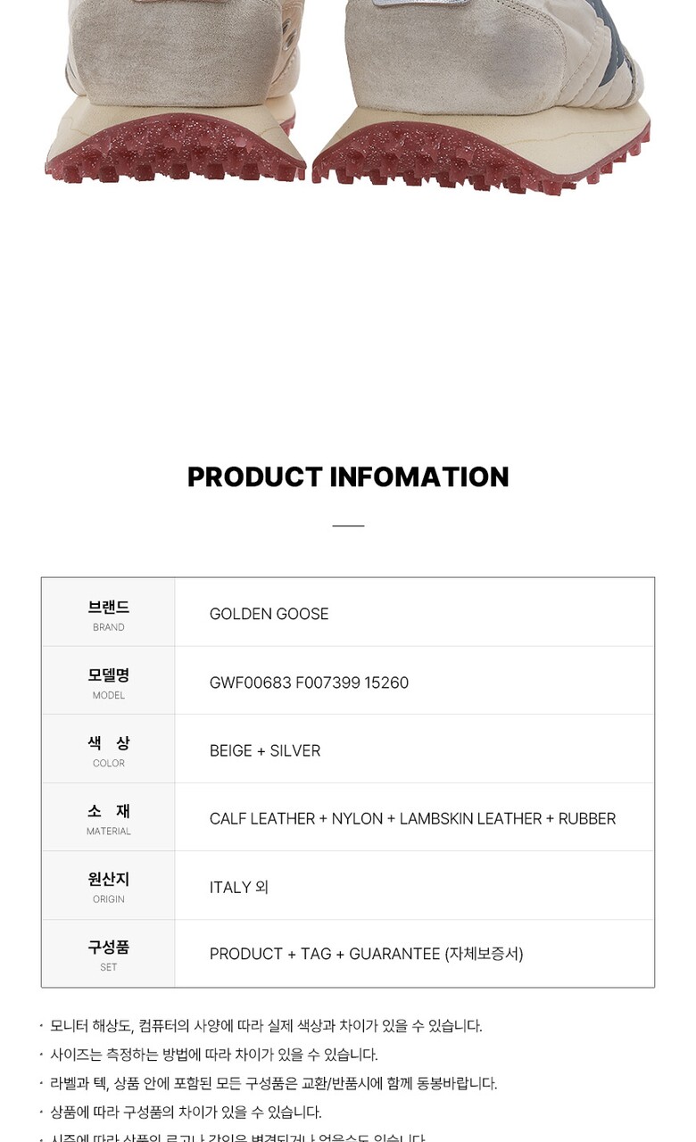 1. 제품 소재 (운동화인 경우에는 겉감, 안감을 구분하여 표시) 소가죽 + 나일론 + 양가죽 + 러버