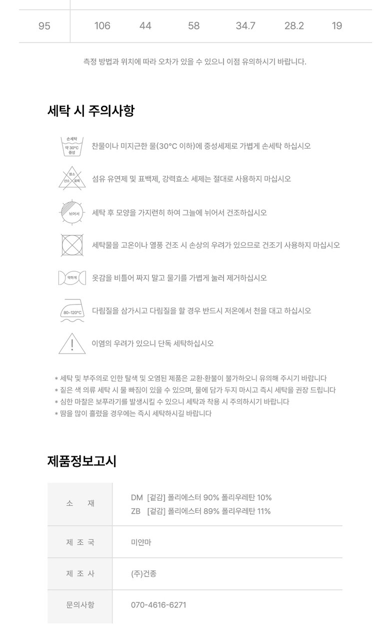 | 6. 세탁방법 및 취급시 주의사항 | 상세페이지 표기 |