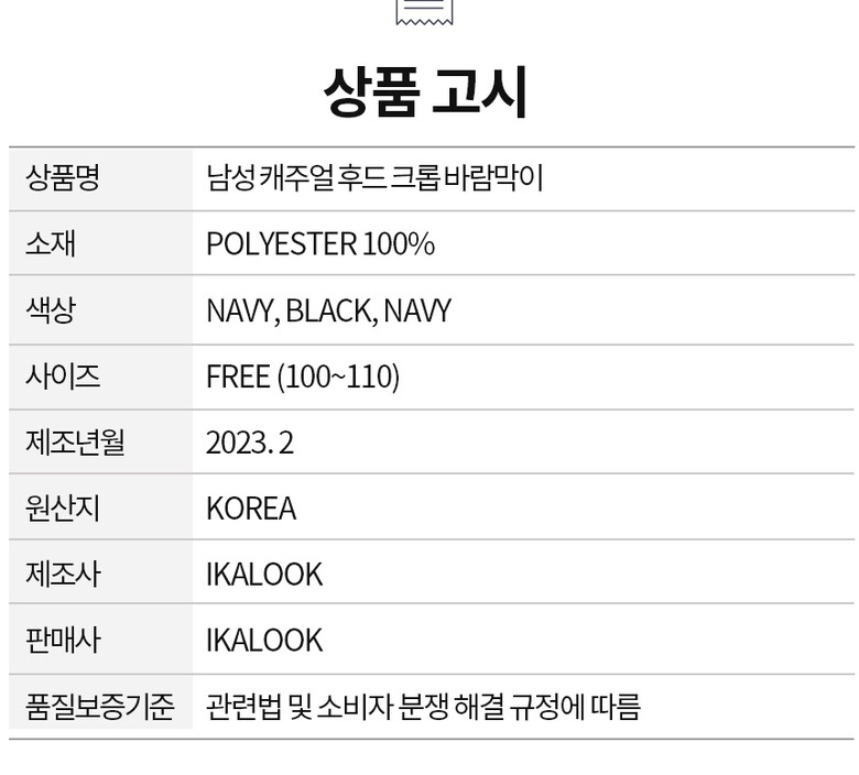 1. 제품 소재 (섬유의 조성 또는 혼용률을 백분율로 표시, 기능성인 경우 성적서 또는 허가서) | 상세페이지 참고 |