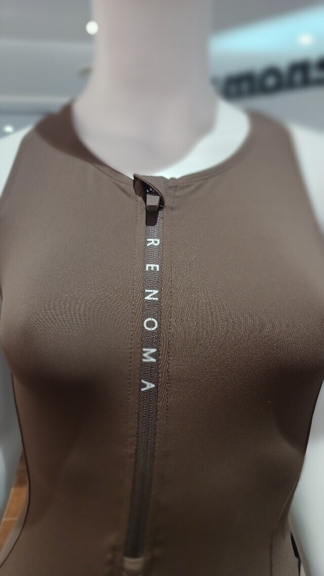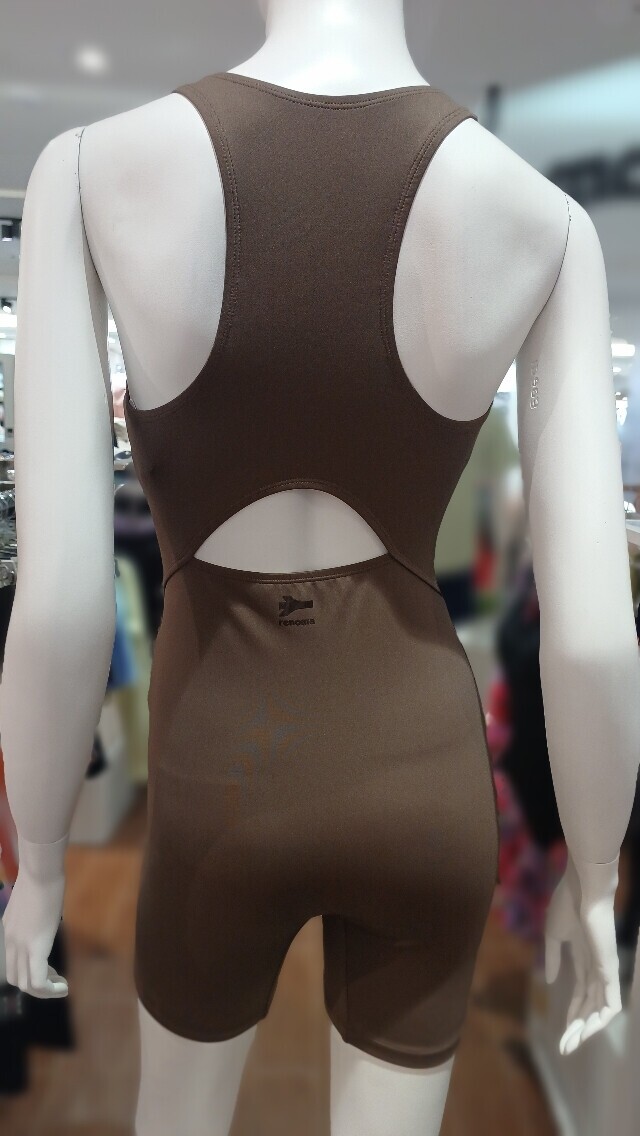 지퍼가 있어 착용이 용이하며 고급스런 브라운컬러가 돋보이는 3부 실내 반신 수영복입니다 .