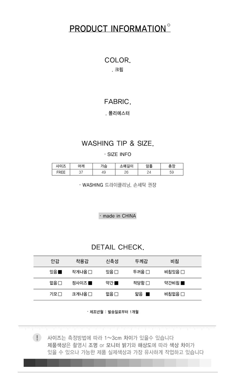 | 1. 제품 소재 (섬유의 조성 또는 혼용률을 백분율로 표시, 기능성인 경우 성적서 또는 허가서) | 상세페이지 기재 |