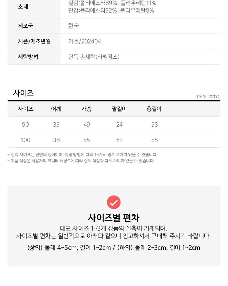 3. 치수 | 90사이즈기준실측 : 어깨35cm, 가슴49cm, 팔24cm, 총길이53cm |