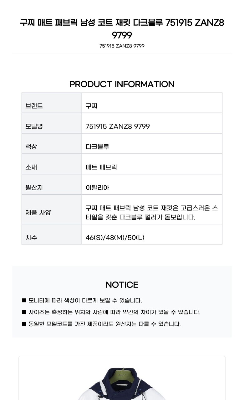 구찌 매트 패브릭 남성 코트 재킷 다크블루 751915 ZANZ8 9799