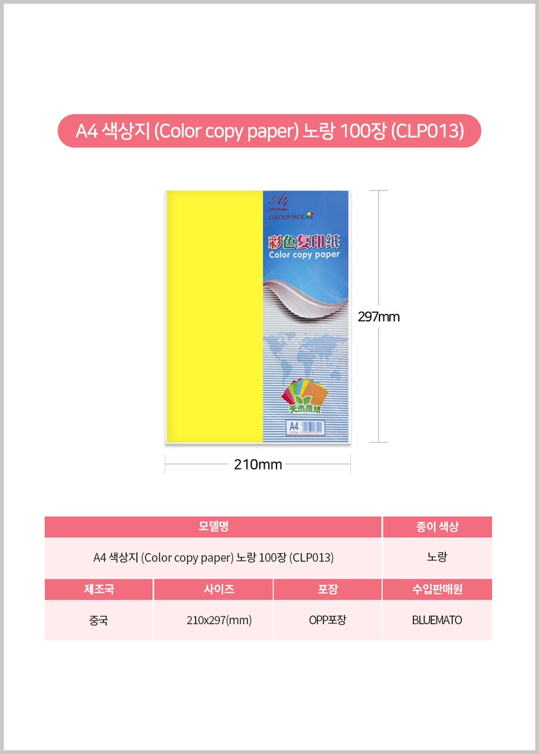 [블루마토]A4 색상지 (Color copy paper) 노랑 100장 (CLP013)