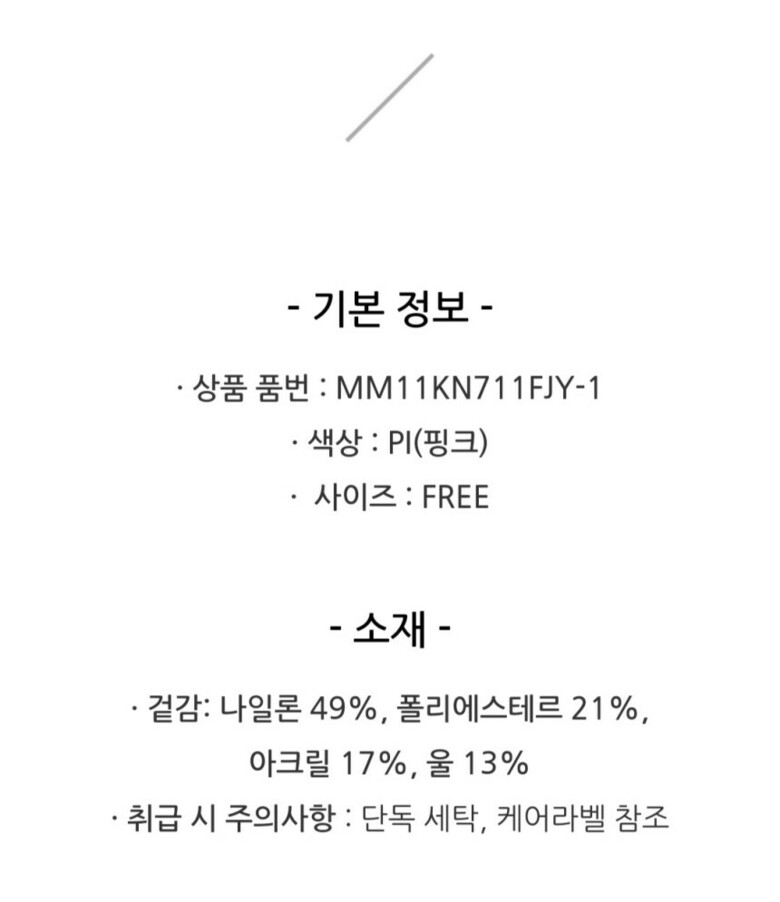 | 1. 제품 소재 (섬유의 조성 또는 혼용률을 백분율로 표시, 기능성인 경우 성적서 또는 허가서) | 나일론 49%, 폴리에스테르 21%, 아크릴 17%, 레이스, 마 |