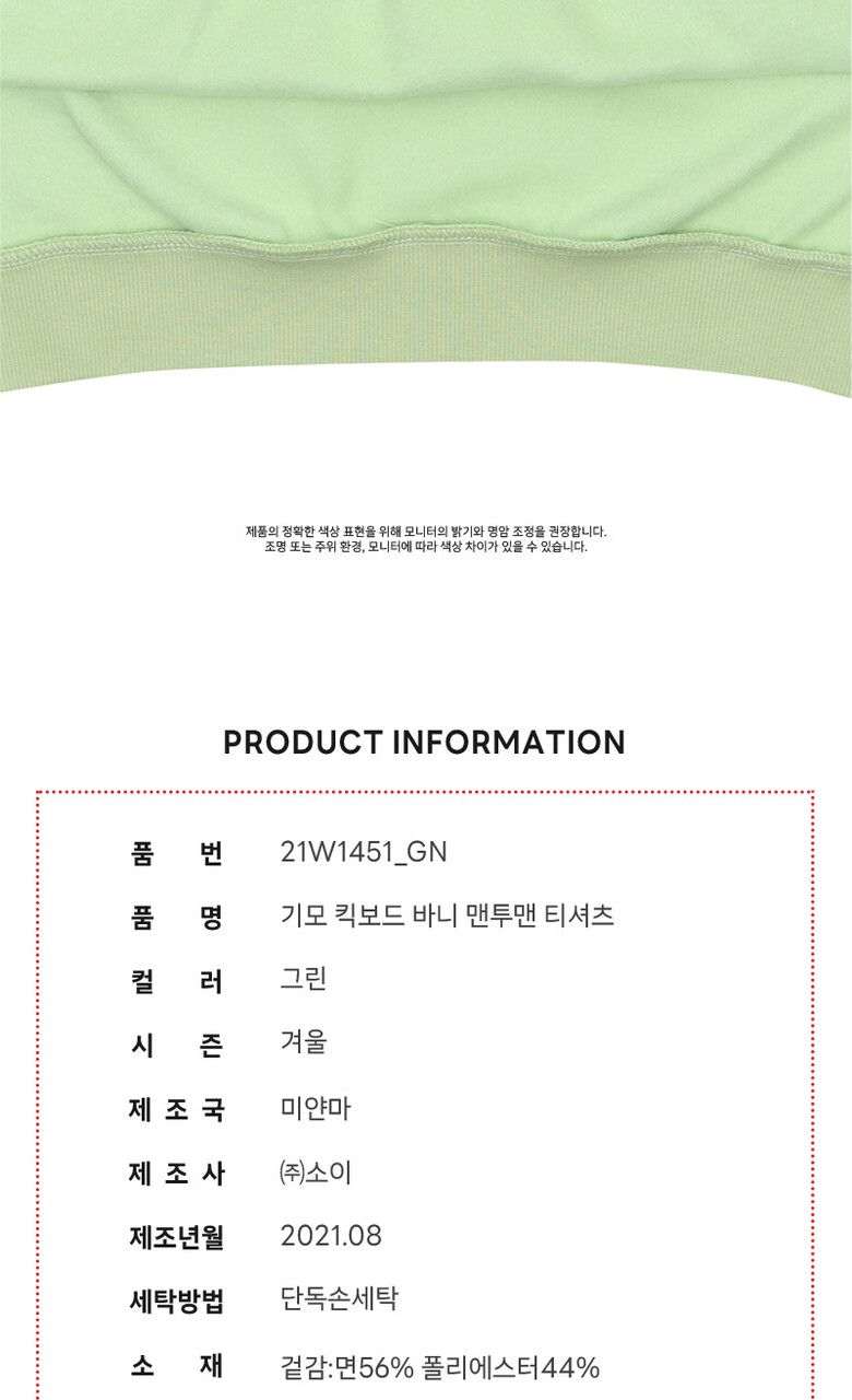 여아 기모 킥보드 바니 맨투맨 티셔츠 21W1451_GN