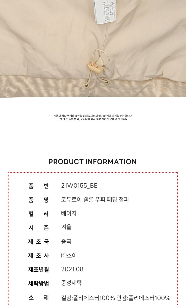 여아 코듀로이 웰론 푸퍼 패딩 점퍼 21W0155_BE