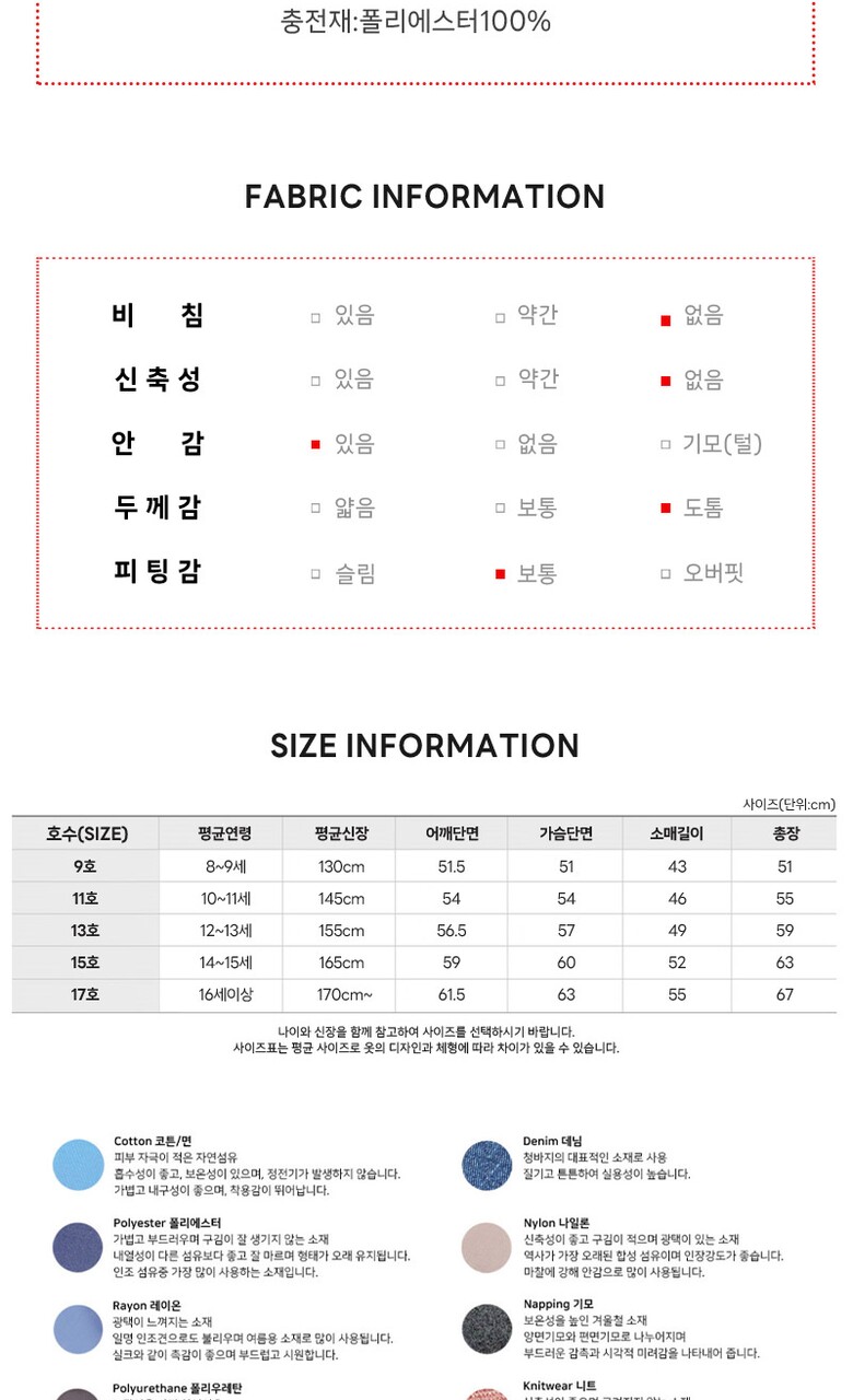 1. 제품 소재 (섬유의 조성 또는 혼용률을 백분율로 표시, 기능성인 경우 성적서 또는 허가서) | 겉감:폴리에스터100% 안감:폴리에스터100% 충전재:폴리에스터100% |