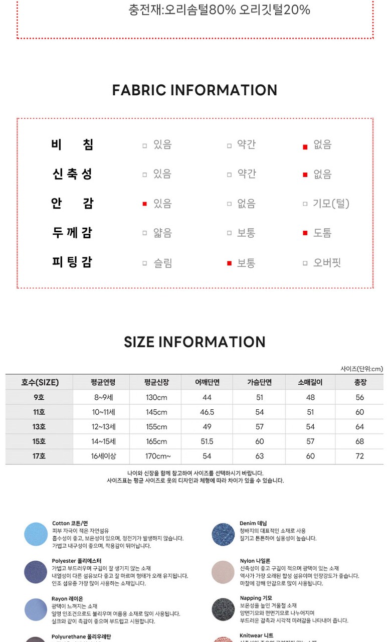 1. 제품 소재 (섬유의 조성 또는 혼용률을 백분율로 표시, 기능성인 경우 성적서 또는 허가서) | 겉감:폴리에스터100% 안감:폴리에스터100% 충전재:오리솜털80% 오리깃털20% |