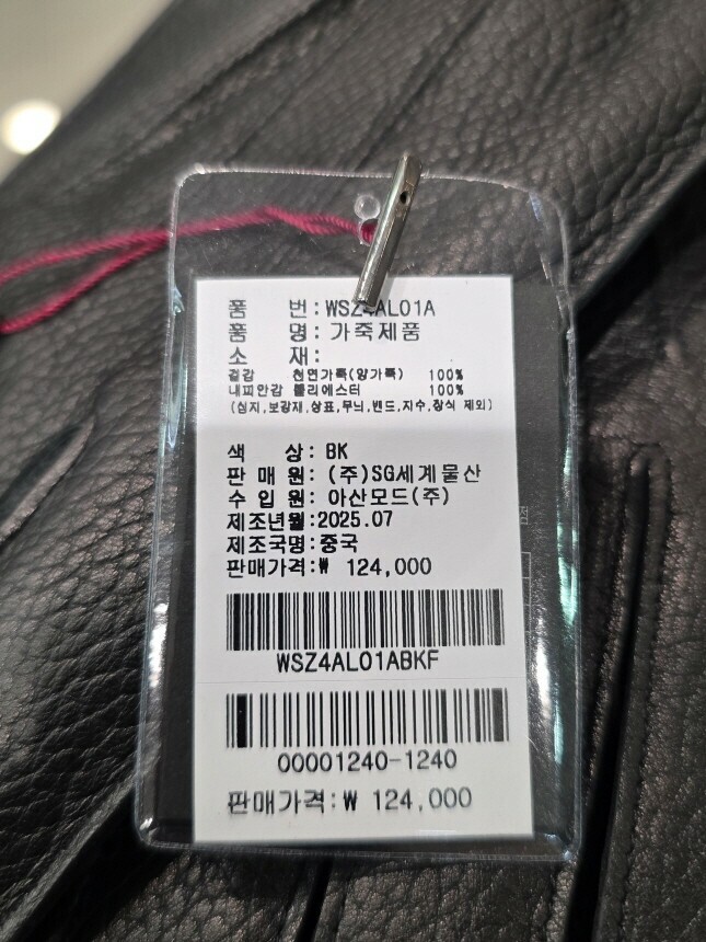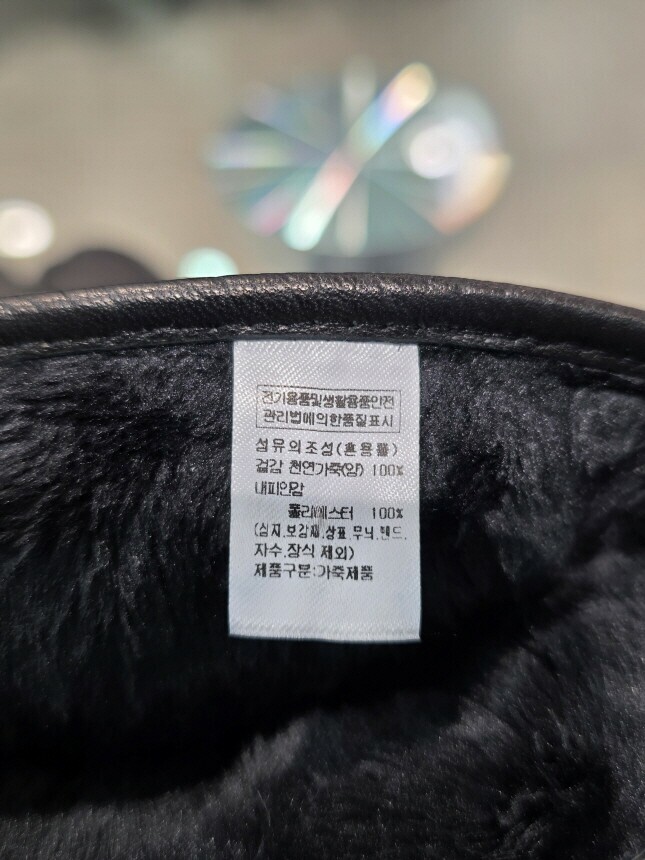 1. 제품 소재 (섬유의 조성 또는 혼용률을 백분율로 표시, 기능성인 경우 성적서 또는 허가서) 겉감 : 천연가죽(양가죽) 100% 안감 : 폴리에스터 100% (심지,보강재