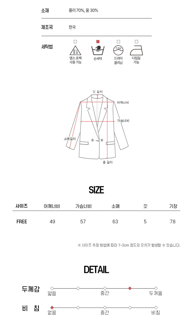 1. 제품 소재 (섬유의 조성 또는 혼용률을 백분율로 표시, 기능성인 경우 성적서 또는 허가서) | 폴리70%, 울30% |