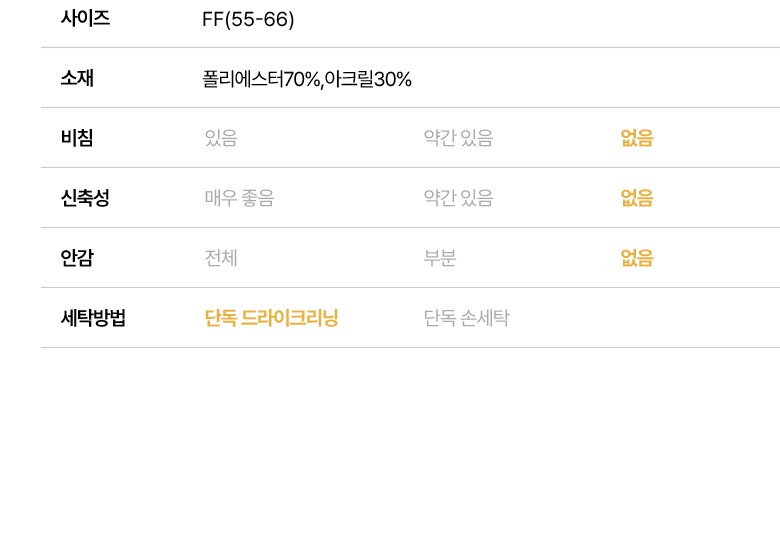 1. 제품 소재 (섬유의 조성 또는 혼용률을 백분율로 표시, 기능성인 경우 성적서 또는 허가서) | 폴리에스터70%,아크릴30% |