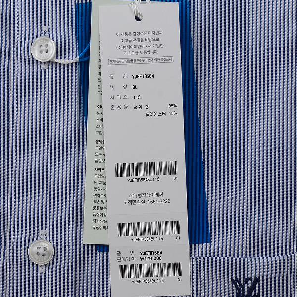 | 1. 제품 소재 (섬유의 조성 또는 혼용률을 백분율로 표시, 기능성인 경우 성적서 또는 허가서) | 면85%/폴리에스터15% |