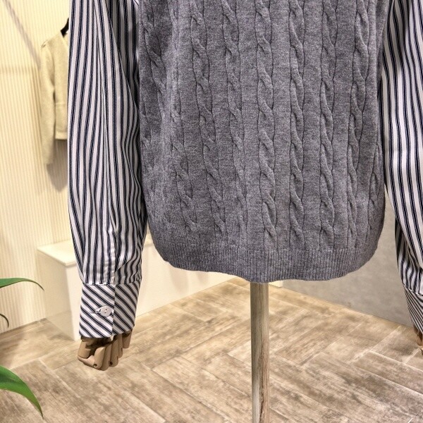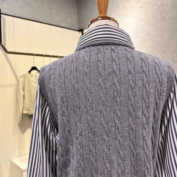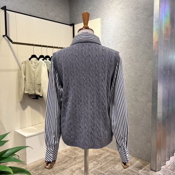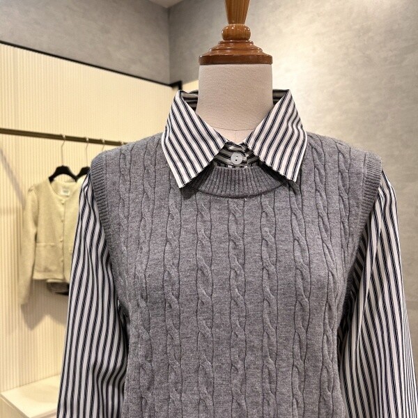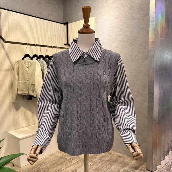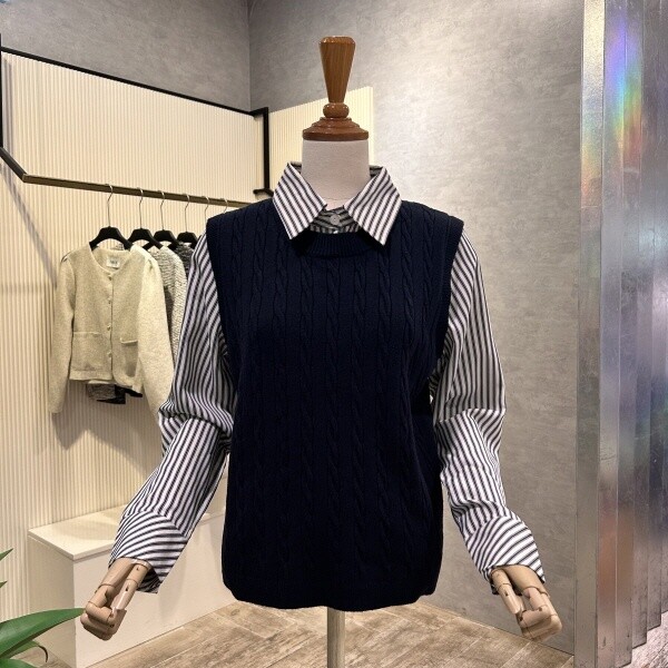 2025년 f/w?신상 니트 베스트 레이어드 배색 셔츠 입니다.캐쥬얼 하면서 세련된 디자인이 포인트 아이템 입니다.