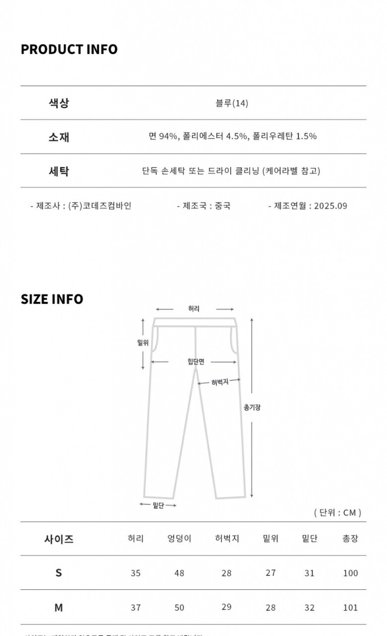 1. 제품 소재 (섬유의 조성 또는 혼용률을 백분율로 표시, 기능성인 경우 성적서 또는 허가서) S,M