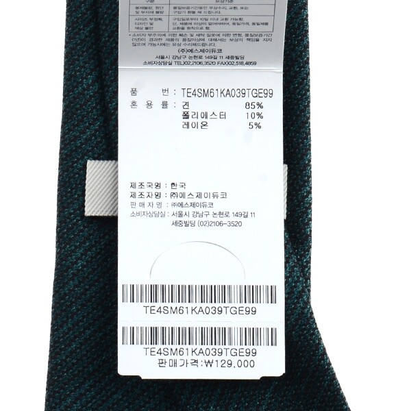 | 6. 취급시 주의사항 | -넥타이 보관시 매듭을 풀고 보관해 주십시요.-구김이 가지 않도록 길게 걸어두시는것이 좋습니다.-니트 타이의 경우, 장기간 걸어두시면 늘어날 수 있습니다. -둥글게 말아서 보관해 주십시요. - 접어서 보관하실 경우, 모양이 망가질 수 있으니 피해 주십시요.-물세탁시 제품의 광택 및 색상이 감소될 우려가 있습니다. -세탁시 사용시 모양이 망가질 수 있습니다. |