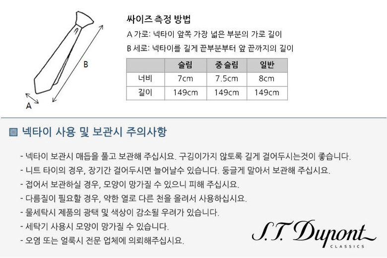 취급 시 주의사항 : -넥타이 보관시 매듭을 풀고 보관해 주십시요.-구김이 가지 않도록 길게 걸어두시는것이 좋습니다.-니트 타이의 경우, 장기간 걸어두시면 늘어날 수 있습니다. -둥글게 말아서 보관해 주십시요. - 접어서 보관하실 경우, 모양이 망가질 수 있으니 피해 주십시요.-물세탁시 제품의 광택 및 색상이 감소될 우려가 있습니다. -세탁시 사용시 모양이 망가질 수 있습니다.