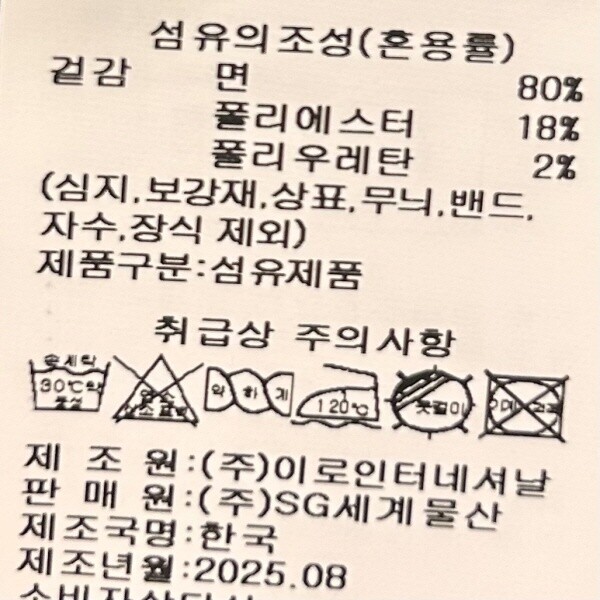 제품소재 : 겉감-면80% 폴리에스터18% 폴리우레탄2%