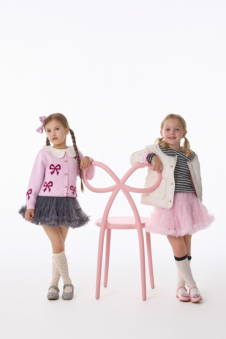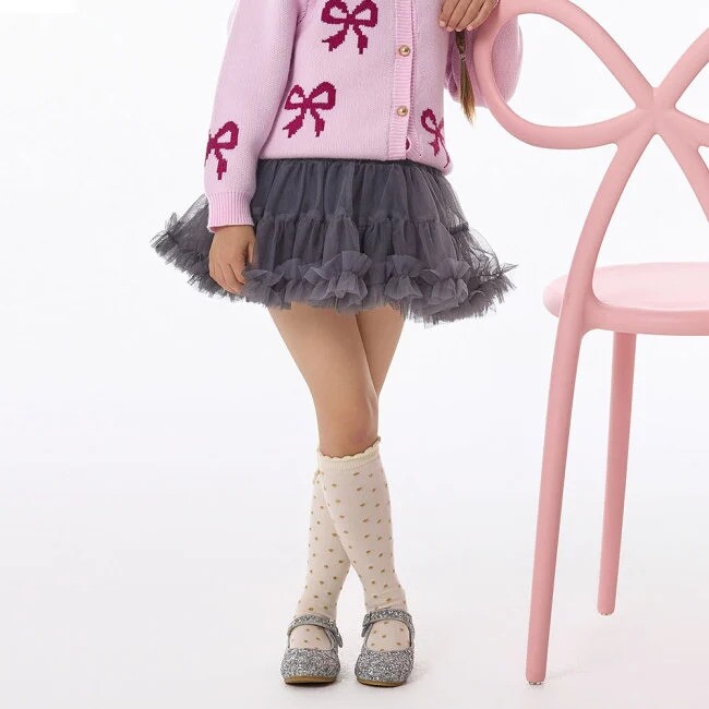 은은하게 반짝이는 골드빛 도트 패턴과 상단에 더해진 작은 리본 자수 포인트가 아이의 룩에 사랑스러운 반짝임과 고급스러운 분위기를 더해줘요.