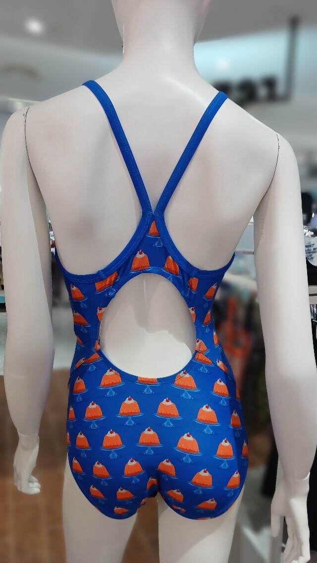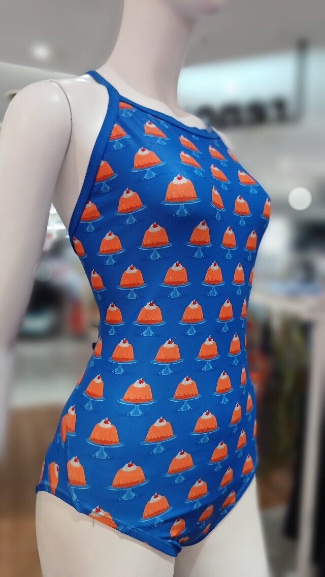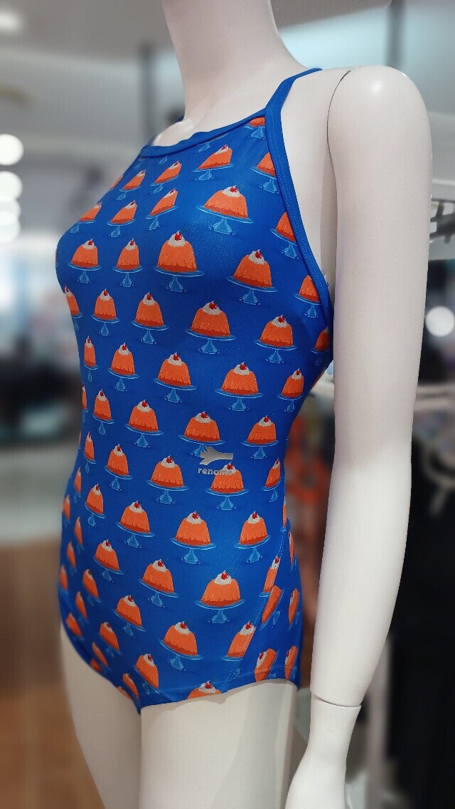푸딩 프린팅이 돋보이는 제품으로 등라인이 매력적인 다이아몬드백 미들컷 실내수영복입니다.