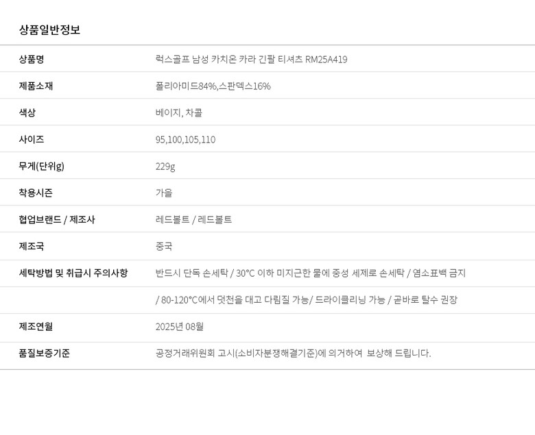 | 1. 제품 소재 (섬유의 조성 또는 혼용률을 백분율로 표시, 기능성인 경우 성적서 또는 허가서) | 상세설명참고 |