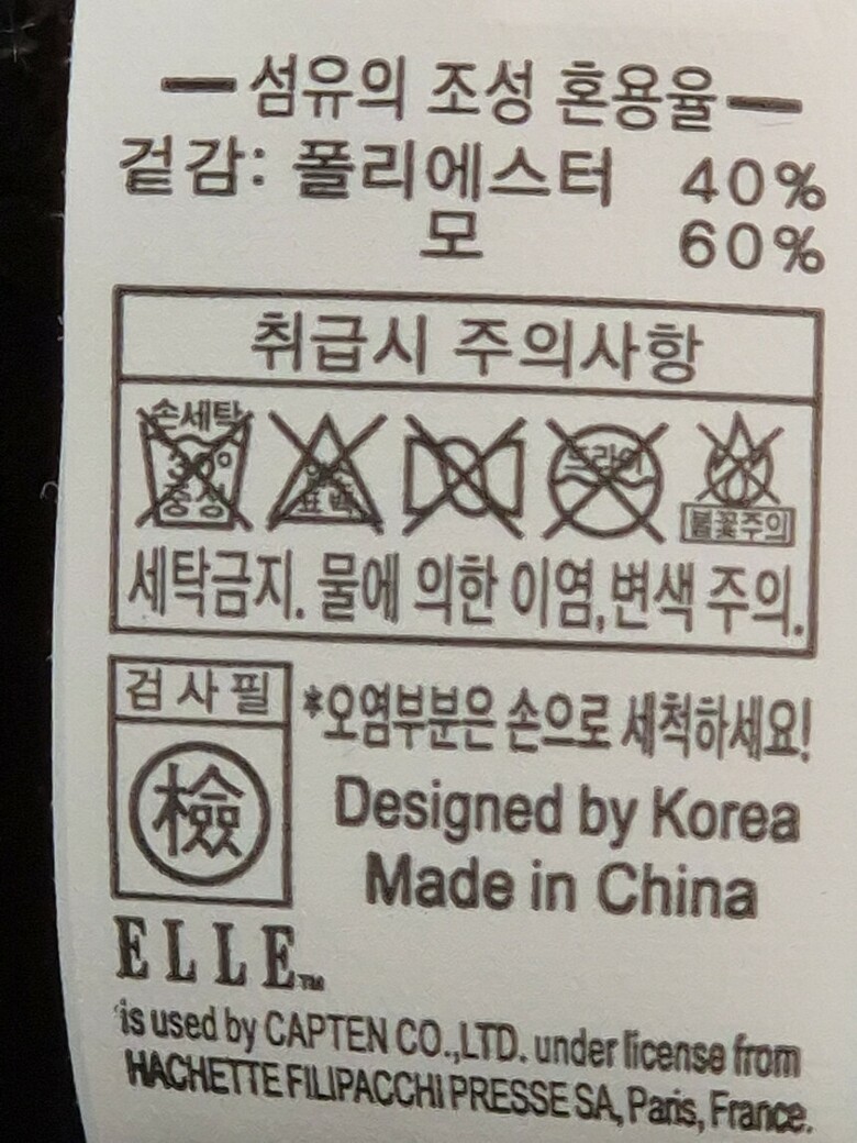 | 2. 소재 | 폴리에스테르 40%, 모 60% |