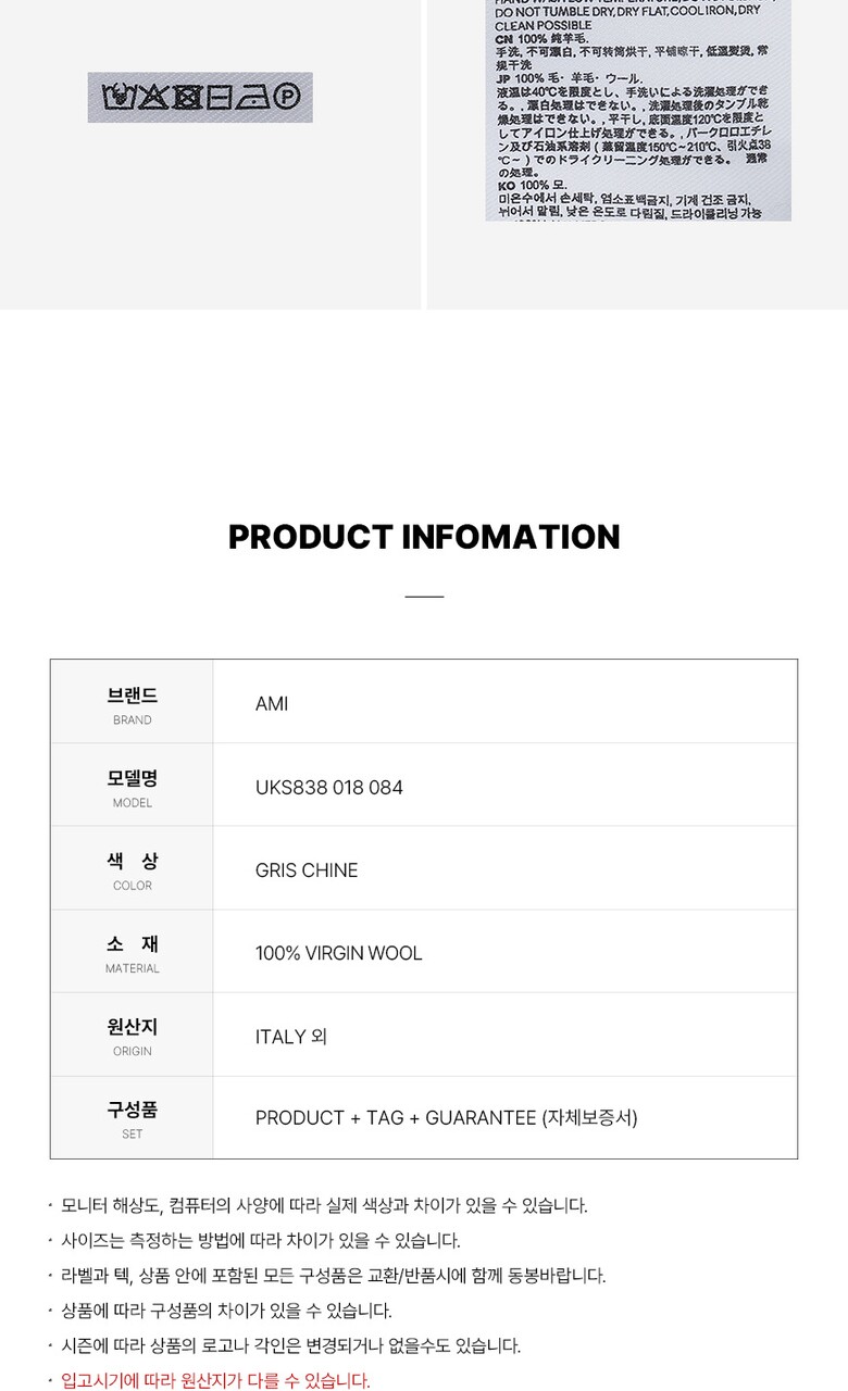 1. 제품 소재 (섬유의 조성 또는 혼용률을 백분율로 표시, 기능성인 경우 성적서 또는 허가서) | 버진울 100% |