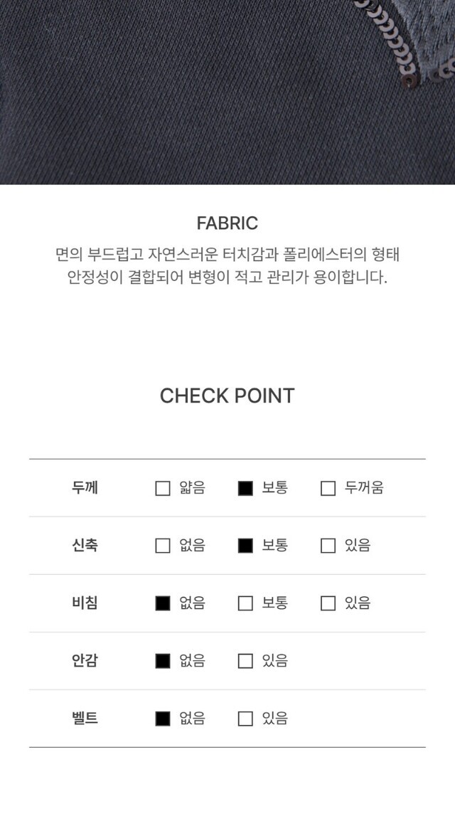 1. 제품 소재 (섬유의 조성 또는 혼용률을 백분율로 표시, 기능성인 경우 성적서 또는 허가서) | 상품상세참조 |