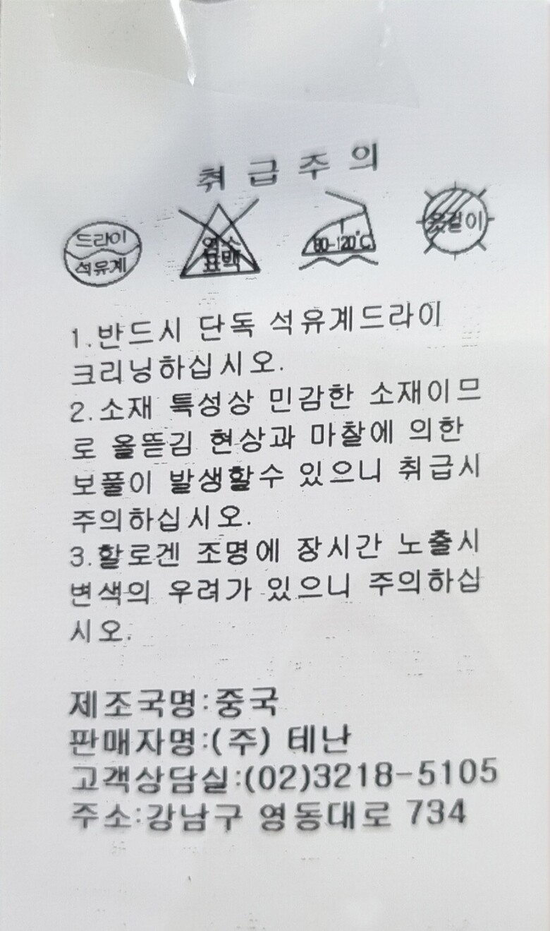 6. 세탁방법 및 취급시 주의사항 | 1.반드시 단독 석유계 드라이크리닝하십시오. 2.소재 특성상 민감한 소재이므로 올뜯김현상과 마찰에 의한 보풀이 발생할 수 있으니 취급시 주의하십시오. 3.습윤시 마찰에 의한 이염현상에 주의하십시오. |