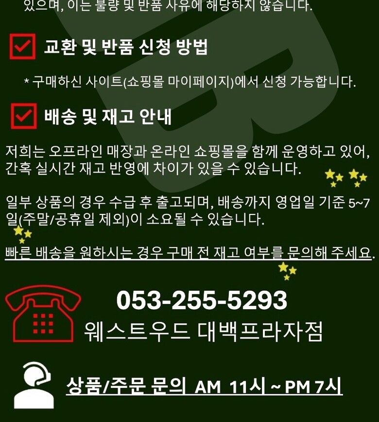 A/S 책임자와 전화번호 : AS 및 기타 문의 사항은 해당 매장 [김진곤,053-255-5293] 으로 전화주시면 감사하겠습니다.
