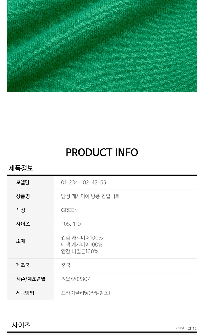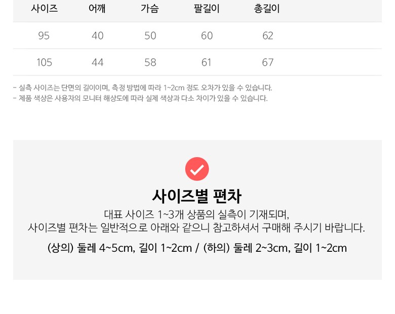 3. 치수 95사이즈기준실측 : 어깨40cm, 가슴50cm, 팔길이60cm, 총길이62cm