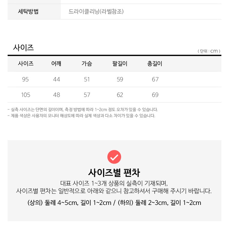 3. 치수 | 95사이즈기준실측 : 어깨44cm, 가슴51cm, 팔길이59cm, 총길이67cm |
