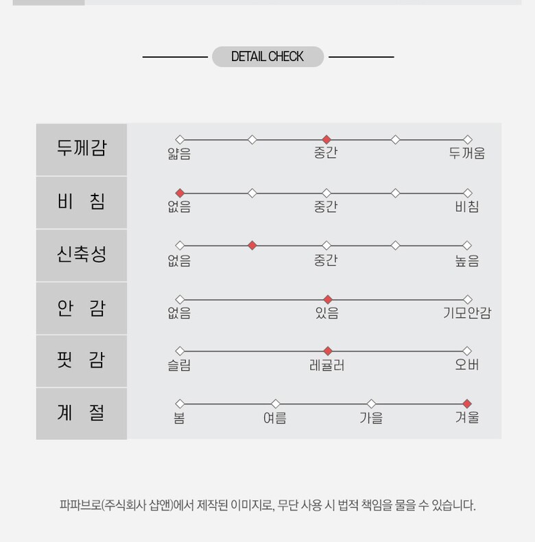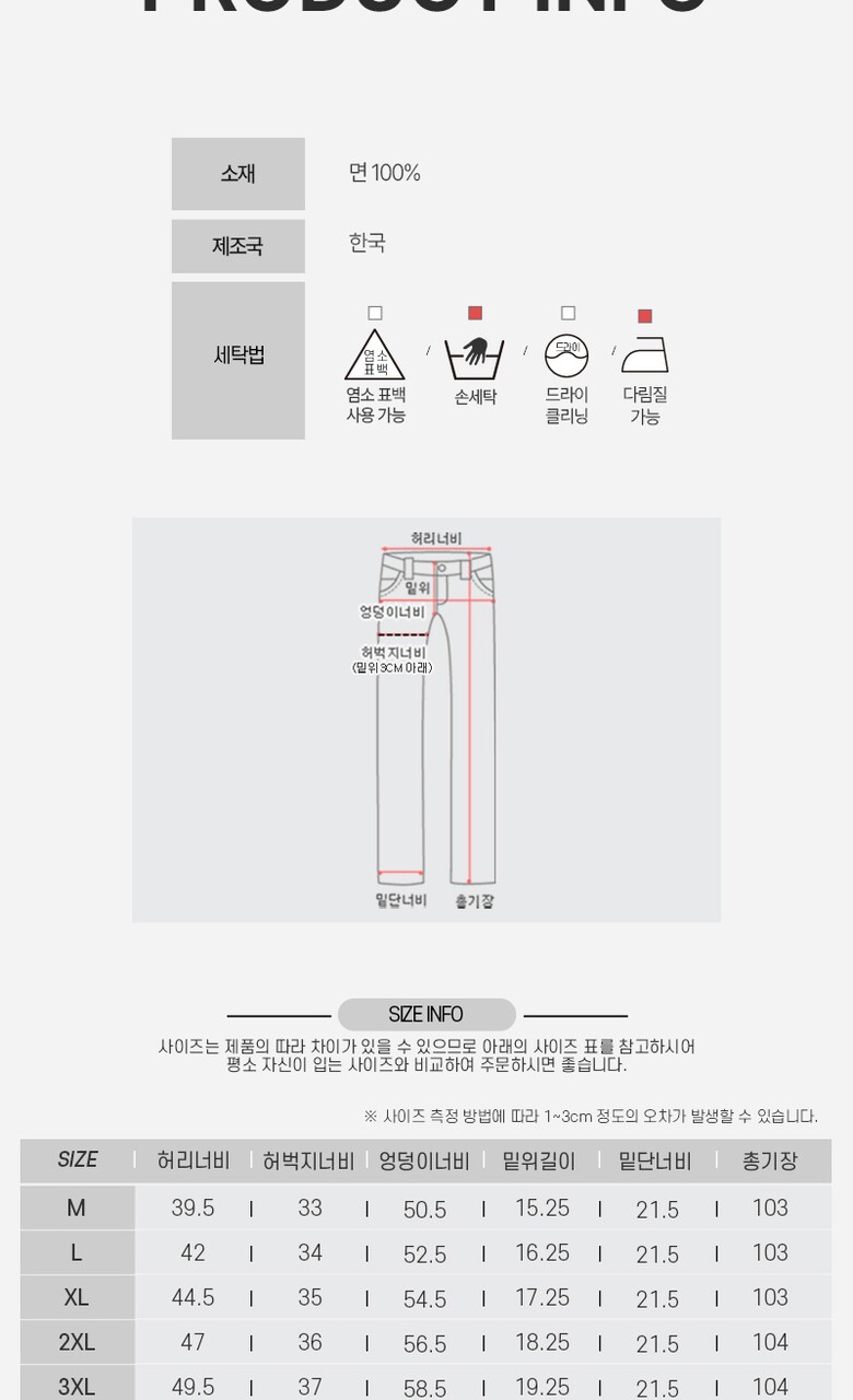 1. 제품 소재 (섬유의 조성 또는 혼용률을 백분율로 표시, 기능성인 경우 성적서 또는 허가서) | 겉감: 코튼 98% , 스판 2%, 안감: 폴리에스터 100% |