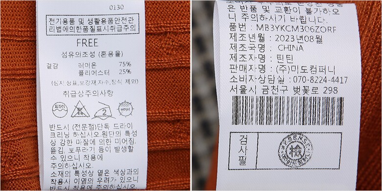 | 1. 제품 소재 (섬유의 조성 또는 혼용률을 백분율로 표시, 기능성인 경우 성적서 또는 허가서) | 겉감-폴리에스터25% 레이온75% |