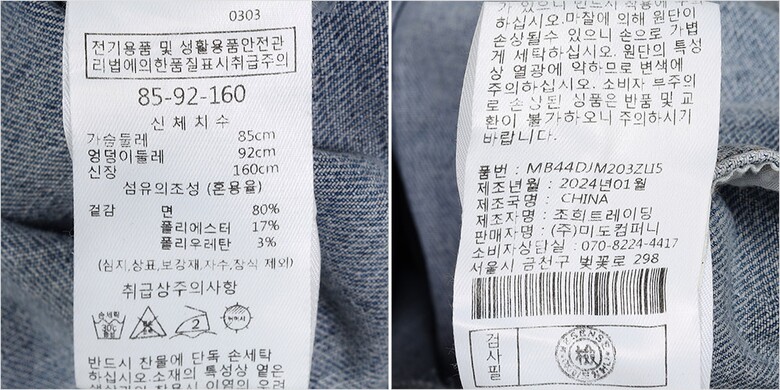 | 1. 제품 소재 (섬유의 조성 또는 혼용률을 백분율로 표시, 기능성인 경우 성적서 또는 허가서) | 겉감-면80% 폴리에스터17% 폴리우레탄3% |