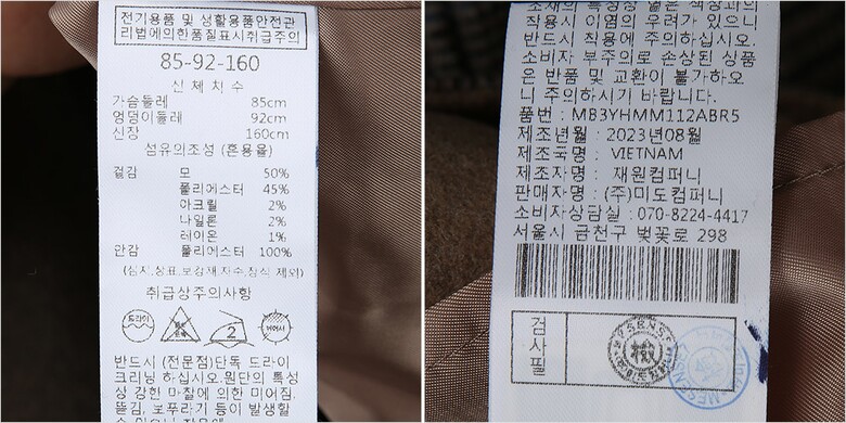 1. 제품 소재 (섬유의 조성 또는 혼용률을 백분율로 표시, 기능성인 경우 성적서 또는 허가서) 겉감-폴리에스터45% 나일론2% 레이온1% 아크릴2% 모50% 안감-폴리에스터100%