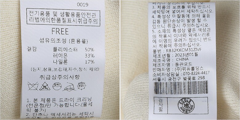 1. 제품 소재 (섬유의 조성 또는 혼용률을 백분율로 표시, 기능성인 경우 성적서 또는 허가서) 겉감-폴리에스터50% 나일론17% 레이온33%