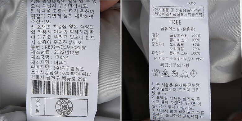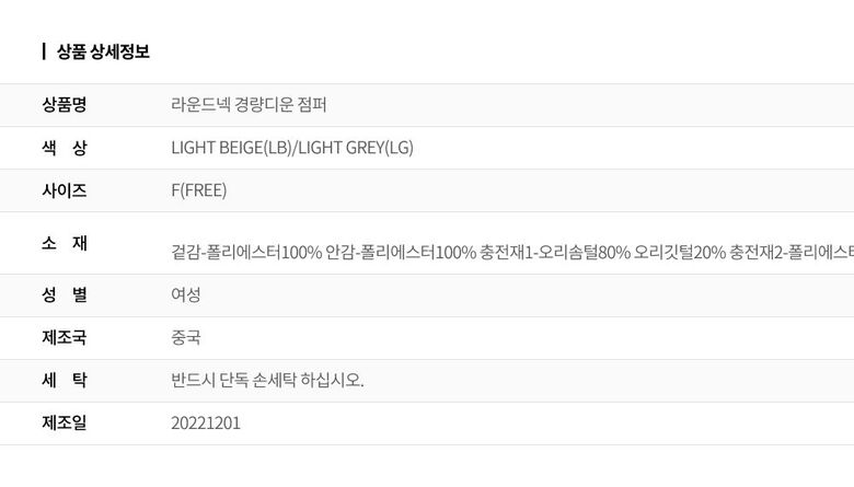 1. 제품 소재 (섬유의 조성 또는 혼용률을 백분율로 표시, 기능성인 경우 성적서 또는 허가서) 겉감-폴리에스터100% 안감-폴리에스터100% 충전재1-오리솜털80% 오리깃털20% 충전재2-폴리에스터100%
