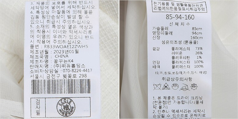 | 1. 제품 소재 (섬유의 조성 또는 혼용률을 백분율로 표시, 기능성인 경우 성적서 또는 허가서) | 겉감-폴리에스터73% 폴리우레탄1% 레이온26% 안감-폴리에스터100% 배색-폴리에스터100% |