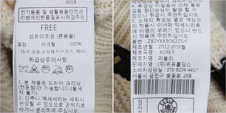 1. 제품 소재 (섬유의 조성 또는 혼용률을 백분율로 표시, 기능성인 경우 성적서 또는 허가서) 겉감-아크릴100%