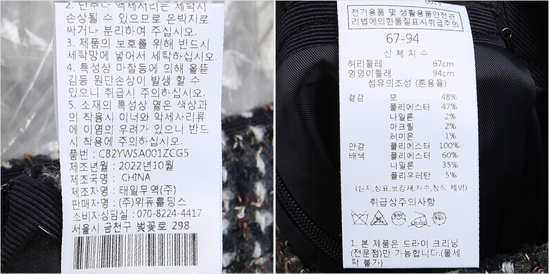 | 1. 제품 소재 (섬유의 조성 또는 혼용률을 백분율로 표시, 기능성인 경우 성적서 또는 허가서) | 겉감-폴리에스터47% 나일론2% 레이온1% 아크릴2% 모48% 안감-폴리에스터100% 배색-폴리에스터60%나일론35%폴리우레탄5% |