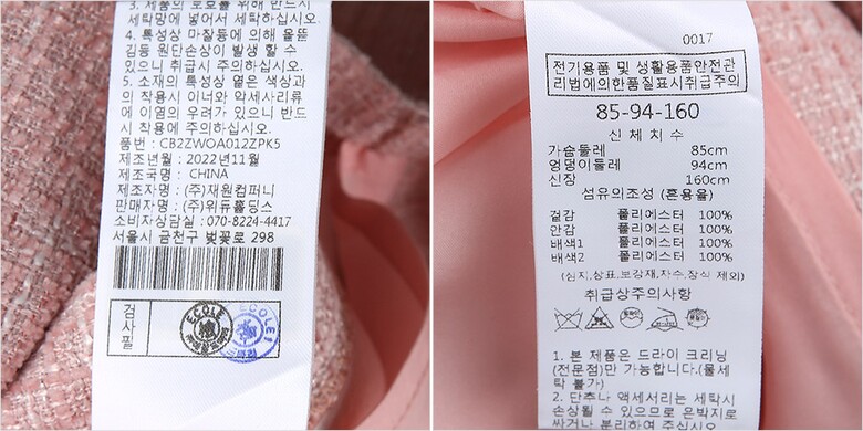 | 1. 제품 소재 (섬유의 조성 또는 혼용률을 백분율로 표시, 기능성인 경우 성적서 또는 허가서) | 겉감-폴리에스터100% 안감-폴리에스터100% 배색1-폴리에스터100% 배색2-폴리에스터100% |