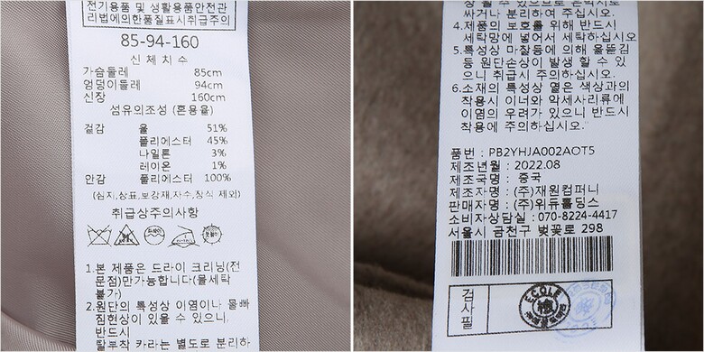 1. 제품 소재 (섬유의 조성 또는 혼용률을 백분율로 표시, 기능성인 경우 성적서 또는 허가서) 겉감-폴리에스터45% 나일론3% 레이온1% 울51% 안감-폴리에스터100%