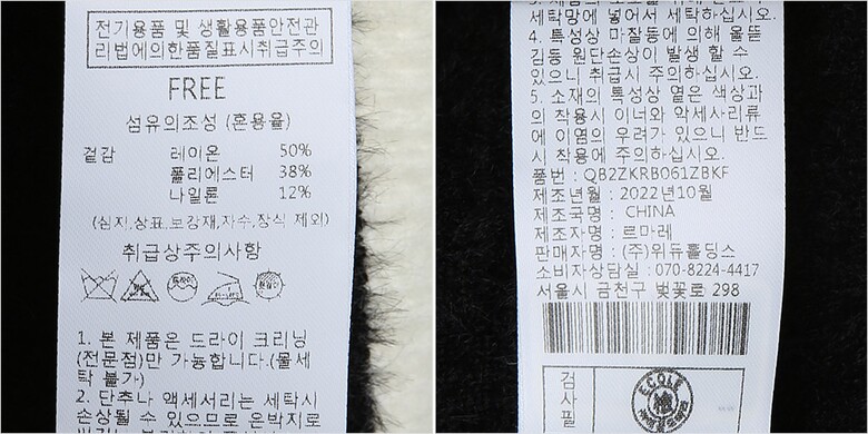 | 1. 제품 소재 (섬유의 조성 또는 혼용률을 백분율로 표시, 기능성인 경우 성적서 또는 허가서) | 겉감-폴리에스터38% 나일론12% 레이온50% |